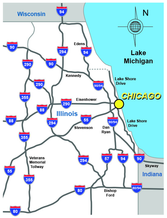 If approaching from the north, northwest or O’Hare Airport, follow I-190 East to I-90 East. This turns into I-90/94 East (Dan Ryan Expressway). Keeping to the right, follow to I-55 North (Stevenson Expressway) onto US-41 South (Lake Shore Drive).