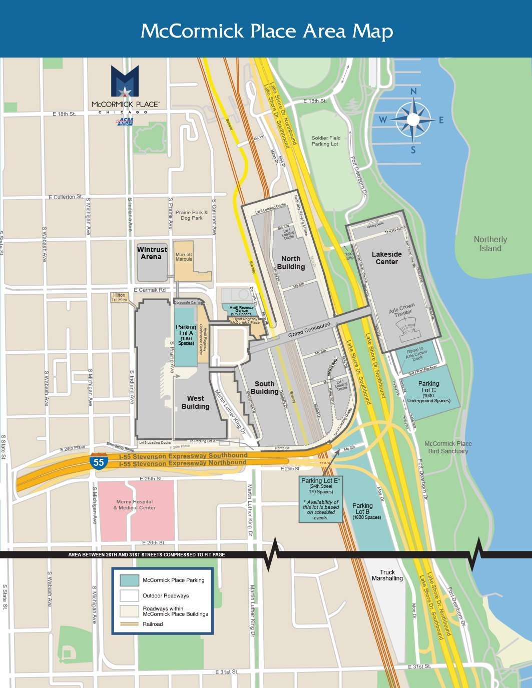 There are three main parking lots on the McCormick Place campus. All are in close proximity and walking distance to our convention complex and are ADA accessible.